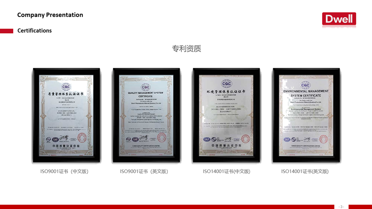 Suzhou Dwell New Material Technology Co.,Ltd. is a high-tech enterprise, which pays attention to the application and protection of invention patents. It has passed ISO9001 and ISO40001 international certification.